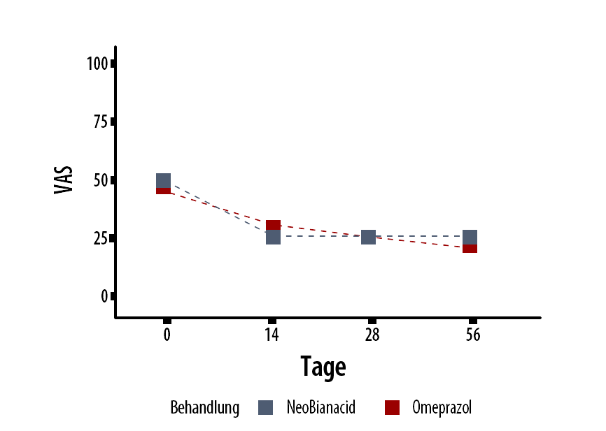 Die klinische Studie zeigte, dass die Wirksamkeit von NeoBianacid mit der von Omeprazol bei der Behandlung von Symptomen in Verbindung mit gastroösophagealem Reflux und Magenschmerzen vergleichbar ist. Zudem benötigten die mit NeoBianacid behandelten Patienten seltener eine unterstützende Therapie in Form von Antazida.